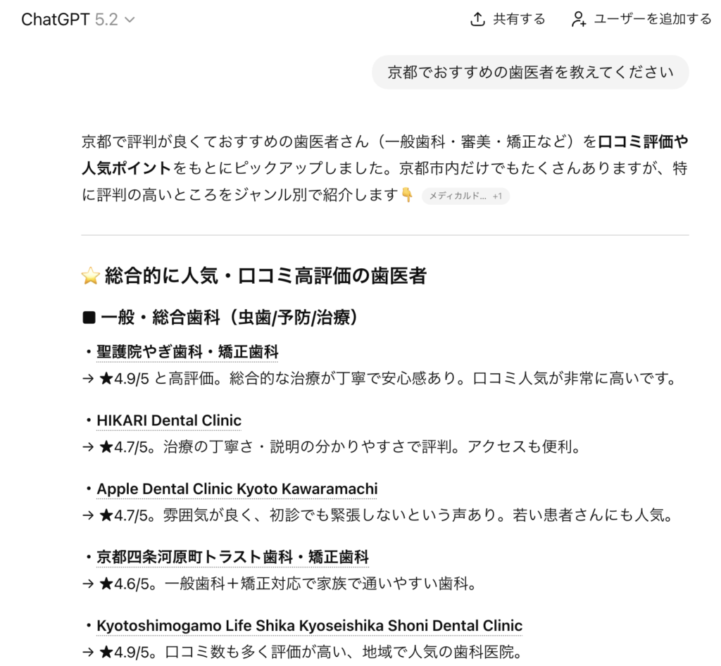 また、ChatGPTで「京都でおすすめの歯医者を教えてください」と聞くと、以下の内容が提案されてリンクをクリックできます。AIとの会話でレコメンドされることで、送客効果が期待できるでしょう。